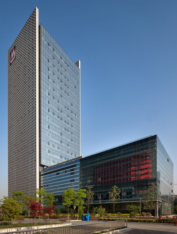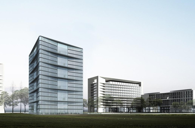 生产用房分别为18层和12层,进深为28.58米。平面适合大空间生产和小开间生产,两种情况均可获得良好的自然光线。立面设计强调简洁、大方、符合研发办公典雅、平和的性格。立面主要以干挂开放式石材和全明框断桥幕墙组成,强调平稳的水平线条和通透性。遮阳板的运用既起到节能作用,也塑造出阴影的层次。