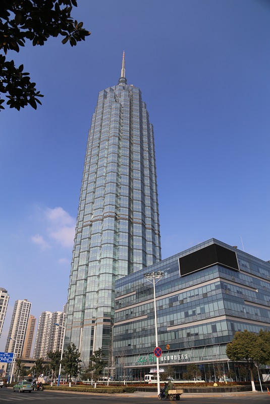 主楼采用单元式玻璃幕墙,采用浅灰色中空LOW-E玻璃单元式幕墙,(外挑铝合金装饰线条);三十六层采用深灰色铝合金防水百页(后衬不锈钢防鸟网)。